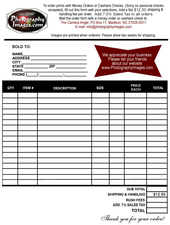 Our photographic prints shown can be purchased with our shopping cart through PayPal in the gallery pages. Prints can be ordered through the checkout system with most credit or debit cards. If you prefer to pay with a money order or cashiers check, (sorry no personal checks are accepted) press the "Print This Page" button below. Fill out the form with the desired item numbers and descriptions. Item numbers can be found if you hover over the thumbnails. Add $12.50 shipping & handling per order. Add 7.00% sales tax to all orders and mail the form with payment to The Camera Angle, PO Box 17, Madison, NC 27025-0017. Due to the large number of images on file, the prints are made as the orders are received. Please allow two weeks for shipping. (Most orders should be shipped sooner.) Thanks again for your interest in photography by Albert Cardwell.
